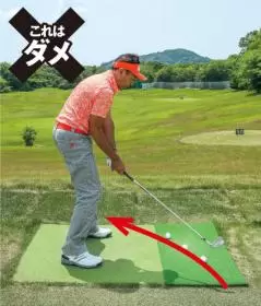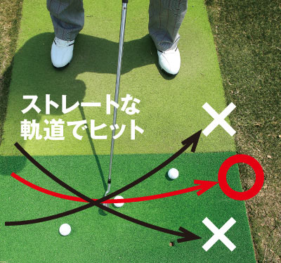 極端なアウトサイドイン軌道はNG。ストレートに近い軌道でとらえよう。