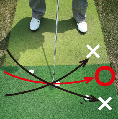 フェースが開いたりかぶったりすると、クラブヘッドが線の右側に当たりやすい。