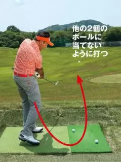 インサイドアウト軌道の修正なら、このようにボールを3個並べるといい。