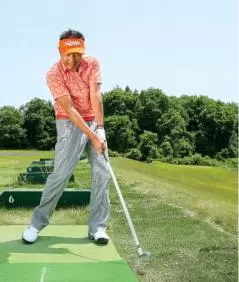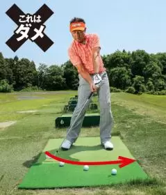 線の外側から下ろさないという意識を持てばダウンブローにとらえやすい。コースでもつねにこのイメージを持つとダフリを防げる。