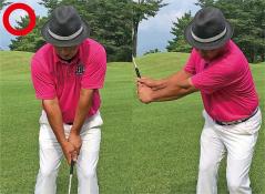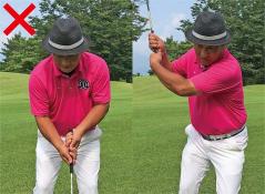 どうしても楽に握れるため、両手ともに下から握ってしまいがちですが、これではクラブを担ぎ上げる形にしかなりません。