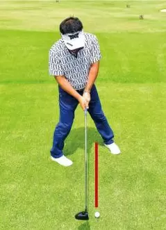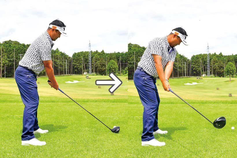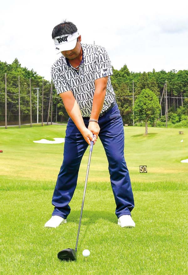 ボールの右サイド(後方)からアドレスするとスクエアに構えやすい。そこからシャット気味にテークバックするのがスライス撲滅の条件。