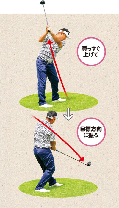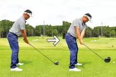体の向きのとおりにバックスイングできても、目標方向に振り出すからスイング軌道がアウトサイドインになる。