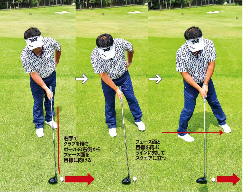 いきなりボールのラインをまたいでアドレスすると右を向きやすい。ボールと目標を結ぶターゲットラインとフェース面の関係を無視して主観的に構えることになるからです。
