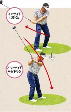 インに引くとアウトから下りるのがクラブを持った体の摂理。右向きは目標に対してインに引きやすいのでアウトから下りる。