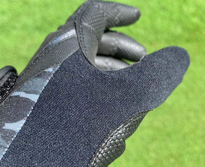 あと、ちょっとした小技として、親指の付け根あたりの生地が汗拭きパッドになっていて、暑い日のプレーの時とかは役立っちゃうんですよ。これ意外に便利かも。このグローブは洗う事もできるので、汗を拭いても洗っちゃえば臭くなったりもしないしね。