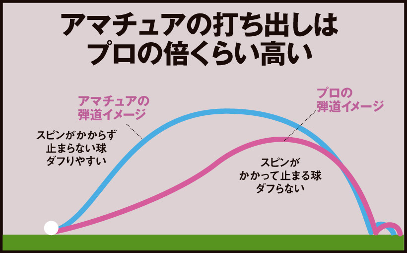 実際、アマチュアの出球はプロの倍くらい高い。スピンが効いた球は打ち出しが低くなる。低い球を打とうとすればダフりづらくなるという寸法だ。