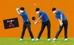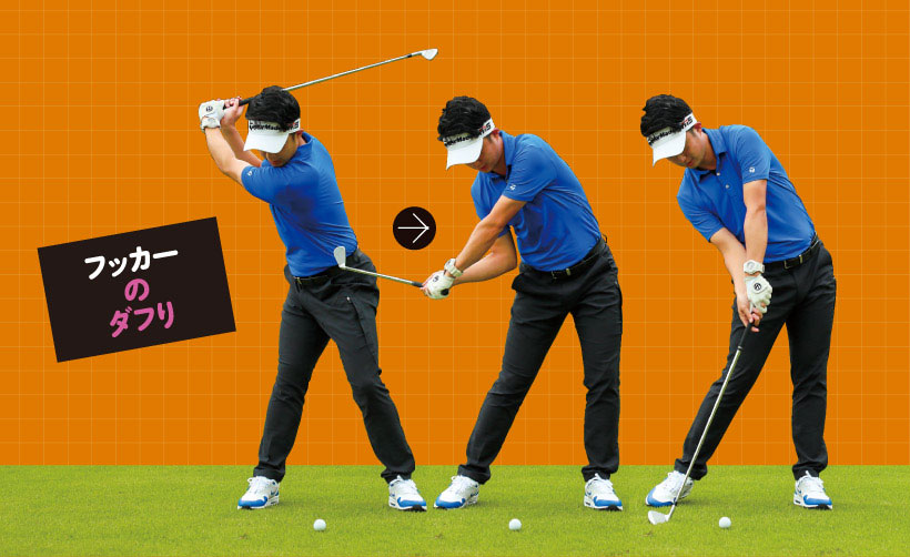 フッカーは下から上にインサイドアウトに振るスタイル。ダフった場合でもボールには当たりやすいが、ヒール側でヒットする傾向が強い。フェースの芯に当たった場合にはヒッカケになる。