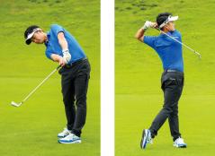 フック系の人はダウンスイング~インパクトで手が前に出すぎるので、左に体を回していくイメージをもつといい。これができると当たりが薄い感じになりますが、それはダウンブローに入ってボールの先のターフが取れるから。はじめはトップ気味の球が出るかもしれません。ダフりのスイングに比べると地面に向かって打っていくのでフォロー、フィニッシュとも低めになります。