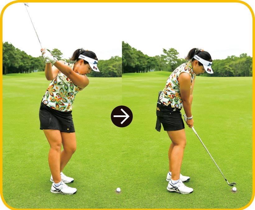 背すじが適度に伸びるとバックスイングで体が回る。手打ちにならずダフりづらい。