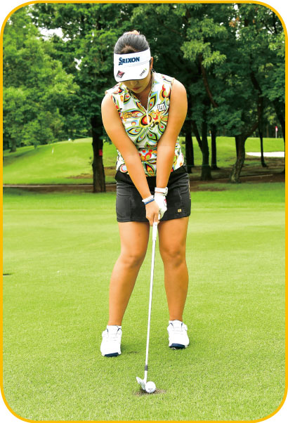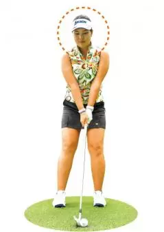 “下目”でアドレスできるとアゴが上に引かれて上体がほどよく起きたいいアドレスになる。