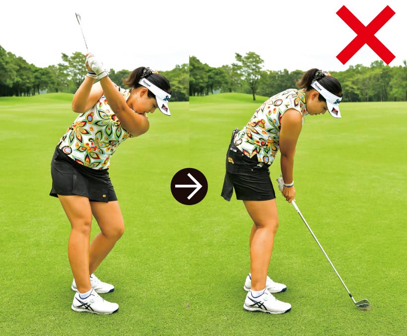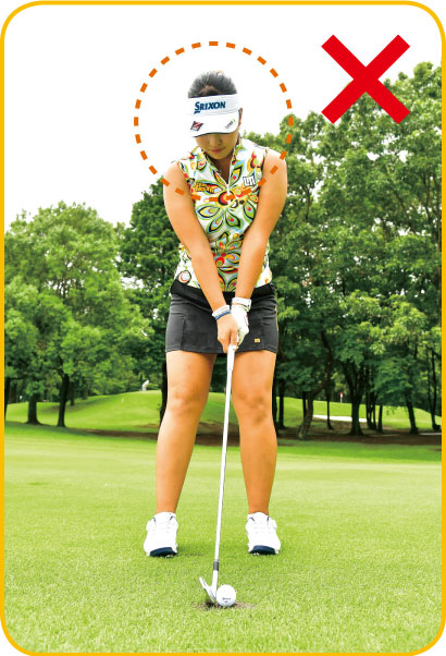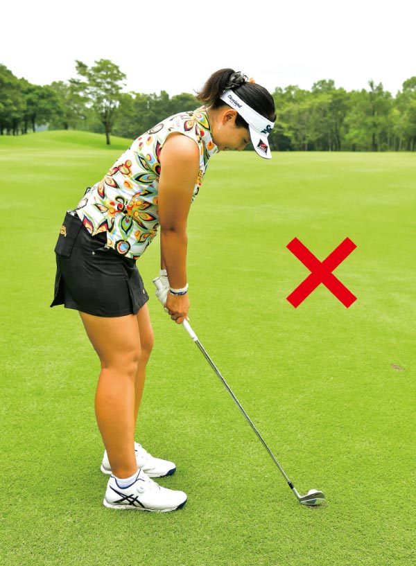 このケースではスイングよりアドレスが悪くなっていることが多い。ちゃんと当てようと思うあまりボールに目が向き、猫背のアドレスになってしまうんです。これだと体が回らず手打ちになってダフります。