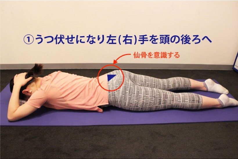 ❶ うつ伏せに寝て、左手を頭の後ろに当てる。右手は体に沿って伸ばす。
