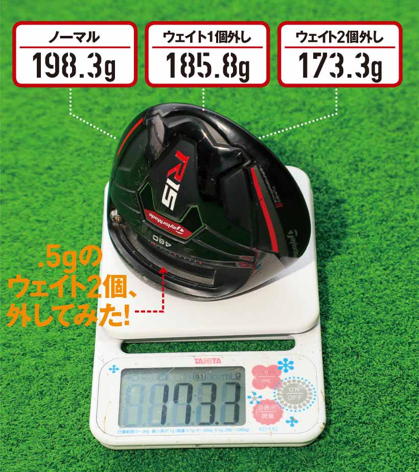 へッドを軽くできるモデルとしてテーラーメイド『R15』を使用。12.5gのウェイトが2個あり、レンチでカンタンに取り外せる。