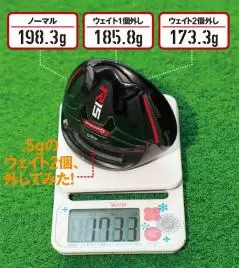 まずは、ノーマル状態、次にウェイトを1個外し、続いて2個とも外した状態でヘッドスピードを計測。それぞれ3球ずつ試打し、最も結果の良いものをデータとして残した。