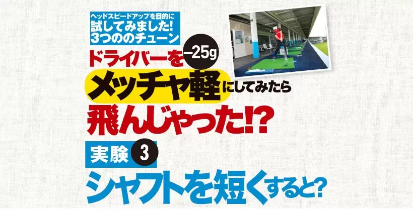 シャフトを短くすることは、常識的にはヘッドスピードダウンにつながるはず。だが、プロの中にも短く持つと振り抜きが良くなり、飛ばせるという意見がある。では、軽いヘッドと組み合わせたらどうなるのか?