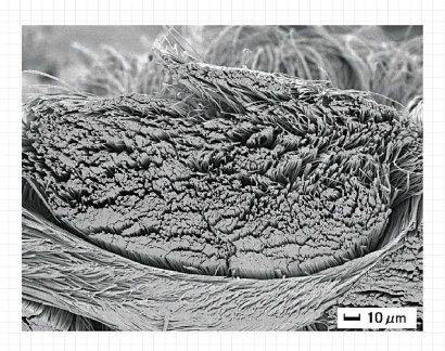 写真はナノテクグローブに使用されている生地の断面の電子顕微鏡写真。ナノサイズの超極細繊維1本1本がグリップに接するから高いグリップ力を発揮する。