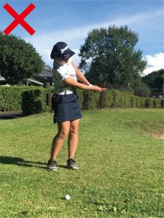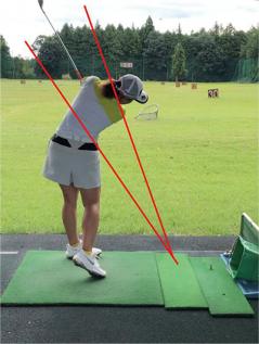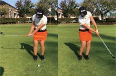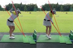 下のラインに重なればアドレス時の高さに綺麗に戻ってくるので、これが理想。きちんとアドレス時の高さに戻ると、体の回転するリズムがよくなり、安定したショットが打てるんです。逆に手元が浮くと、ヘッドがインサイドから入りすぎてダフリ気味になったり、方向のブレが大きくなってしまいます。