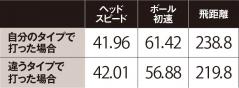 インパクトでボールを押し込むには、最大ヘッドスピードでスクエアにボールをとらえる必要がある。インパクト時にヘッドは減速するが、最大ヘッドスピードで当たればヘッドの遠心力によってボールを押せるのだ。ただし、それには自分に合ったタイプのインパクトが不可欠。PRGRのサイエンス・フィットで計測したところ、違うタイプのインパクトでは、ヘッドスピードが同じでもボール初速が落ち、飛距離が20ヤード近く劣った。
