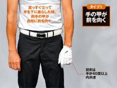 手を垂らした時に甲が前を向く人は、ストロング・グリップで握るのが自然です。腕の回旋度合いが大きいのでスイング中の回旋は少なくなります。たとえば、アドレスで50度回っている人は、腕が最大で90度回旋するとした場合、インパクトまでには40度しか回旋しないことになります。ですから、腕の使用は抑えて体の回転をメインに打つスタイルになります。(タイプ1)