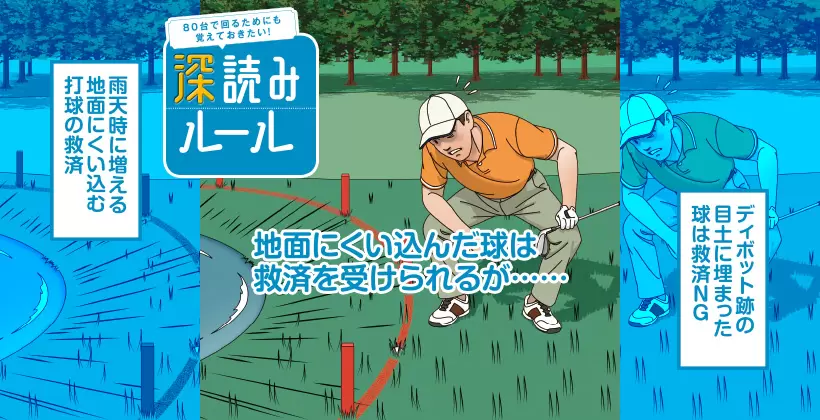 もうひとつ、地面へのくい込み方にも条件がある。「直前のストロークの結果作られた自らのピッチマークの中」でなければならないのだ。事前に誰かが作ったピッチマークに転がり込んだのでは、救済は受けられない。