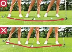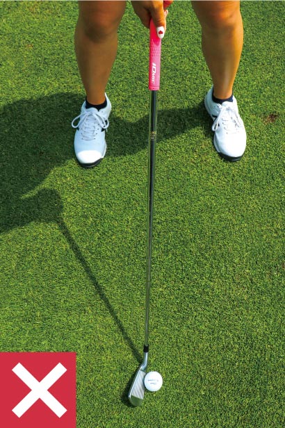 グリップを体の中央に構えたままダウンブローに打とうとすると、上半身が突っ込んでしまう、ただのダフリになってしまいます。