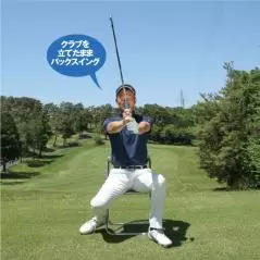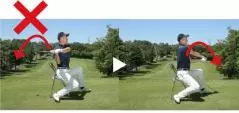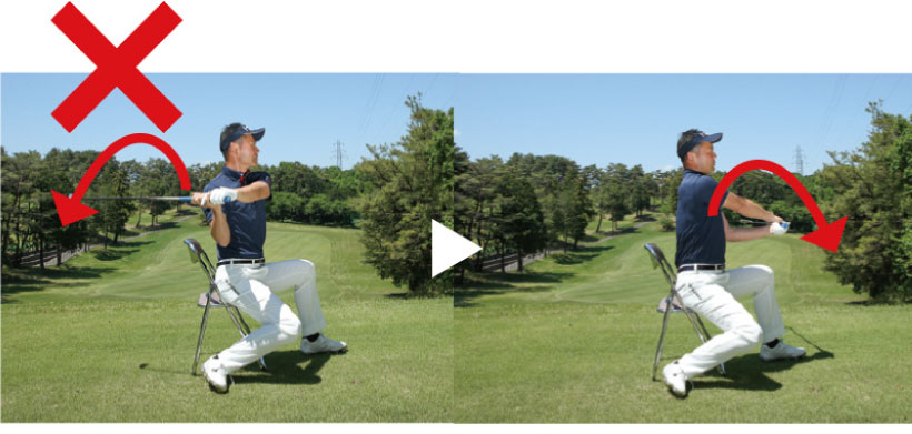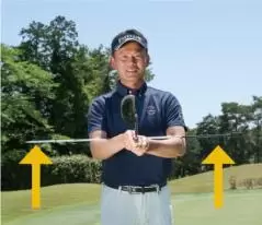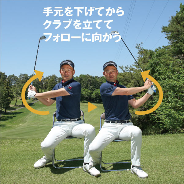 バックスイングやフォロースルーで腕をネジってクラブを寝かせるのはNGです。ヒジを水平に保ち、クラブを立てたままでスイングするのがツボで、実際のスイングもその感覚でクラブを振ればボールを正確にヒットできます。