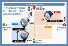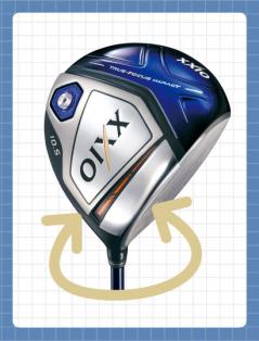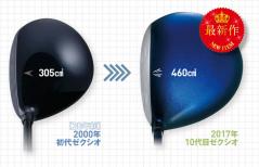 実物大写真の比較でわかる通り、初代ゼクシオは305㎤でかなり小ぶりに見える。当時はこれでも大型ヘッドだったから、今では見慣れた460㎤ヘッドの大きさが改めて感じられる。ヘッド体積は1・5倍、ヘッドの慣性モーメントもほぼ同等の1・45倍。