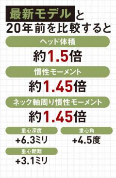 10年前は460㎤に大型化したが、重心位置を設計する余裕がなかった。慣性モーメントは向上したが重心角を大きくできず球のつかまりは向上しなかった。その後の進化で現在のやさしさが達成できた。