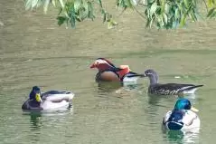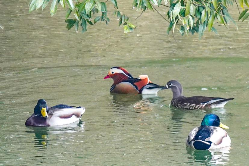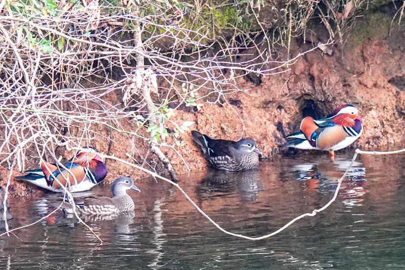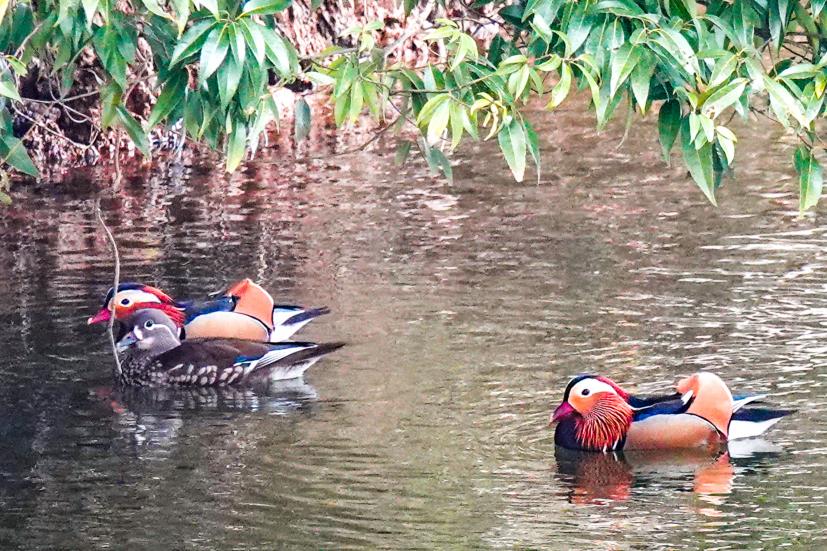 ちなみに今思いつくところでお池でよく見かけるのは、アオサギ(デカい)、ダイサギ(通称シラサギ。デカい)、カルガモ(模様のおかげでいつも笑顔に見える)、カイツブリ(潜水名人。小柄)、コガモ(モヒカン君)、ハシビロガモ(クチバシが幅広い)、マガモ(オスの頭部は美しい緑色)、オナガガモ(尾が長い)、キンクロハジロ(漢字で金黒羽白。目が金色)、ホシハジロ(オスの頭部と首が赤褐色。目は赤)、オシドリ(オスは見たら悶絶するほど美しい色彩)。この中で年中同じところにいる『留鳥』はサギたちとカルガモ、カイツブリ、オシドリ。他の子たちは秋から冬にかけてシベリアなどの北方の地からやってくる渡り鳥(冬鳥)。日本で越冬し、春に日本を離れ、繁殖地に移動します。なのでこれからがいい時期です!“そんなさあ、名前をズラズラ書かれてもさあ”って困惑するかもだけど、まあなにか見かけたら、このどれかに当てはまるかなーと思ってぼんやり眺めていただきたいのです。たとえスコアが悪くても、オシドリ夫婦を目撃できたら気分ちょーアガる。保証する。写真見せるけど、これ、ホンモノをナマで見たら「わー!」ってなる。これホント。