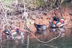 オシドリは雌雄セットで見られることが多く、それで『おしどり夫婦』って言葉が生まれました。確かにオシドリのツガイは繁殖期を迎えると寄り添うように生活するんだけど、それはあくまで卵が孵化するまでの期限付き。オスがメスのそばから離れない理由は実はあぶれたオスからの略奪を防ぐため。上の写真、手前の子はあぶれオスかも。そんで、ヒナが生まれると関係を解消し次の繁殖期には別のメスとペアになるんだって。オシドリ夫婦、敗れたり。なんだか裏切られたような気分かしら。でも、生き残るために遺伝子の多様性を求めているだけなのです。それにしても、どうしてこれだけ多くの色が複雑に配置されることになったのでしょう。自然は不思議です。ちなみにオシドリ、いろんなゴルフ場にいるんだけど、だいたいは次の写真みたいな隅っこの端っこの土手のあたりにいるので見過ごしがち。普段は他のカモにあまり近づかないのでこの時はかなりラッキーでした。ちなみに場所は太平洋クラブ成田コース。時期は2月。