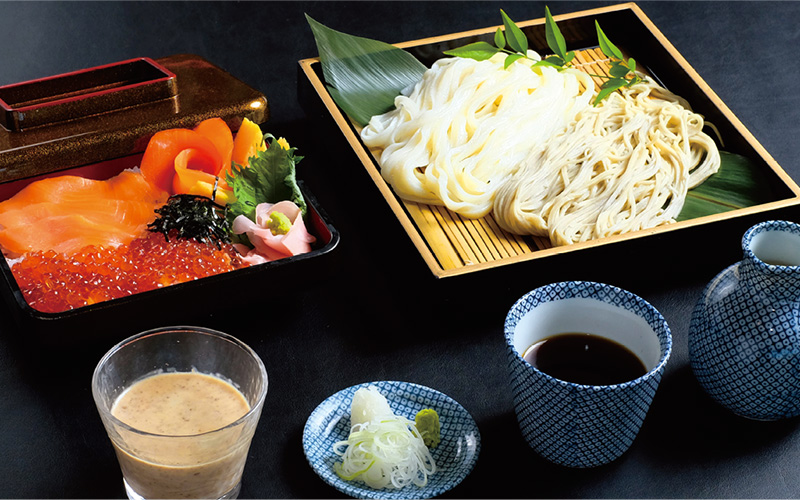 「いくら親子合盛ごまだれ」蕎麦、うどん共にお替り自由で心ゆくまで堪能できる。