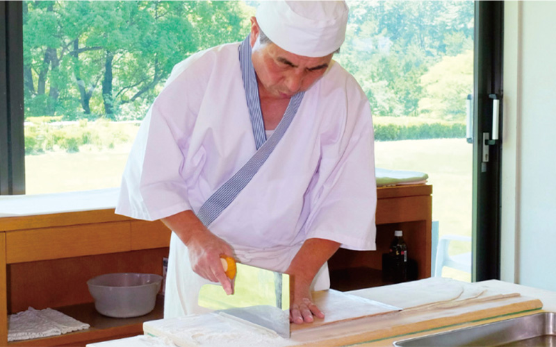 毎朝、蕎麦職人が蕎麦の実を臼で引き、手打ちし腕をふるう。