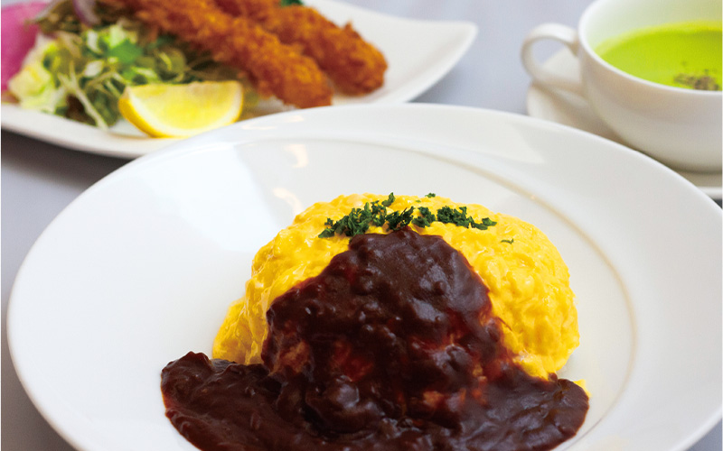 「とろとろオムライス」とろとろの玉子でとじたオムライスにサクサクのエビフライがうれしい!