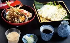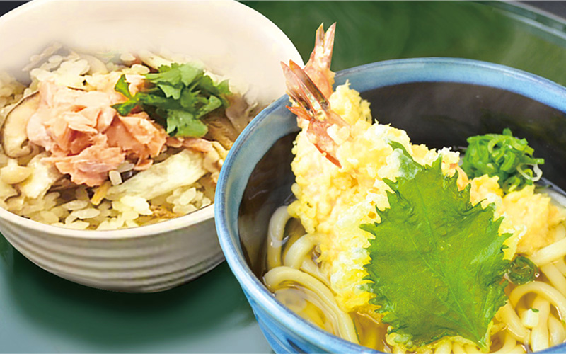 「天ぷらうどんと炊き込みご飯のセット」出汁から拘ったうどんや、素材を吟味した日本食も充実。