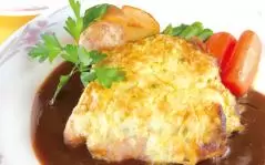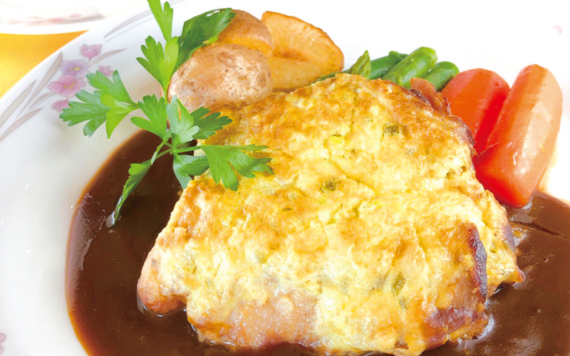 「若鶏のチーズ焼~わさび風味~」国産若鶏を低温調理でやわらかく仕上げ、伊豆の名産、わさびの効いたチーズクリームが、自家製デミグラスソースと相性抜群。