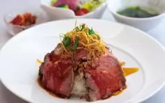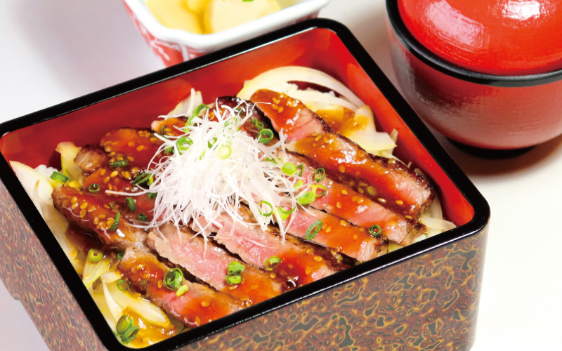 「牛ヒレの和風ステーキ重」希少部位の牛ヒレ肉をお重にし、料理長オリジナルのソースが肉の味を際立たてる。
