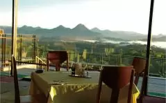 レストランから見える北摂連山の雄大な景観と料理を楽しむ。