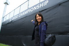 もしかして、まだまだ観戦しに来ている女子プロがいるのではないか? と思った矢先。観客席の裏に書かれた大会名プリントの前で記念撮影中の福田真未と遭遇。「一緒に来てた人とはぐれちゃって〜」と言いながら、ニコニコで撮影に応じてくれた。お礼を言って見送り、スタートホールへと急ぐと、すでにタイガーらはティショットを済ませて大観衆を引き連れてセカンド地点へと歩いて行くところだった。そこでまたまた見慣れた後ろ姿を発見。3度の賞金女王に輝いた実力者、アン・ソンジュである。観客から「アンちゃーん」と声をかけられている。さすが、人気者。さらに、その先に目を向けるとツアー通算23勝の李 知姫が、いそいそと歩いている。声をかけると、「こんな豪華な顔ぶれが一緒にプレーしているところを見られるチャンスなんて、もうないかもしれませんからね。もう楽しみで楽しみで。では、セカンド地点に先回りするので!」と、笑顔で駆けて行った。