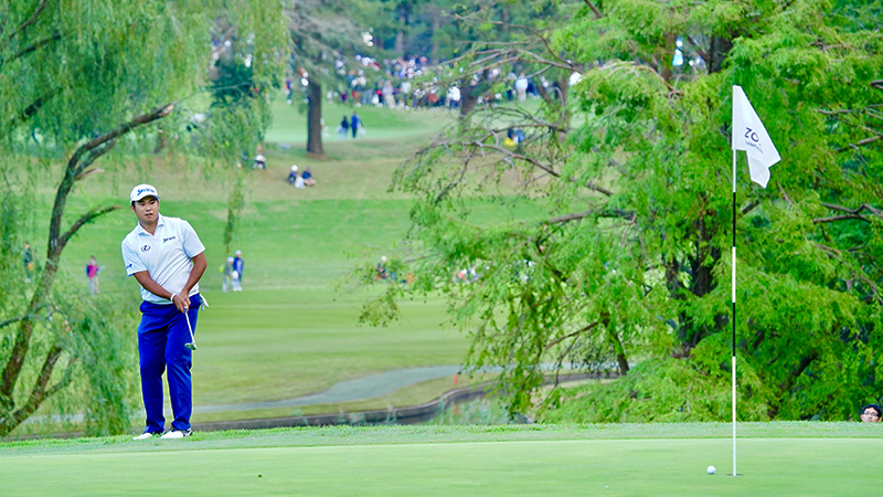 11番の486ヤード・PAR4。松山は左サイドのフェアウェイから、残り約180ヤードのセカンドショットをピン奥2メートルにつける。このパットを沈めて、この日9つ目のバーディを奪う。さらに、続く12番の490ヤード・PAR4は1打目を左サイドのラフに落とすも、セカンドショットを2段グリーンの下につける。ピンまでは約5メートルあったが、この長めのバーディパットを沈め、ZOZO CHAMPIONSHIPで初めてのガッツポーズを見せた。これでトータルのスコアは15アンダー、タイガーに3打差・暫定2位で最終日を迎える。