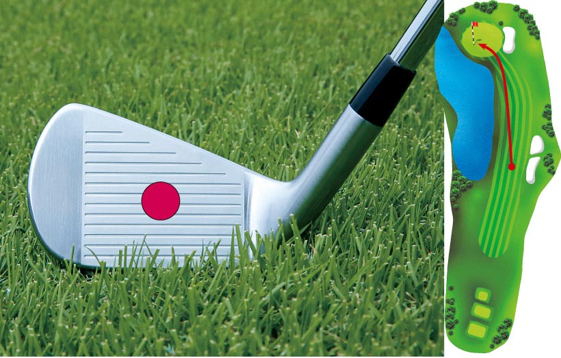 図のような厳しいセッティングではセカンドショットで花道からドローでピンを狙うのが安全な攻め方です。曲がらないクラブでピンを狙ったらナイスオンか池ポチャのギャンブルショットになってしまいます。曲げるショットと曲がってしまったショットの違いは意図的かどうかだけの違いですから、プロは“曲げる”ために“曲がりやすい”マッスルバックを使用しているのです。