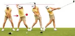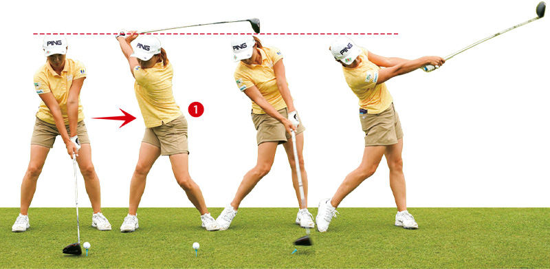 ❶ 頭の高さを変えないことで、バックスイングではお腹がしっかり回って、上半身が捻転したトップになっている。