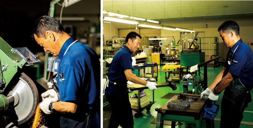研磨には4つの段階があり、ベルトサンダーを使って火花を飛ばす研磨は粗研磨とよばれる第一段階。養老にはクラフトマンのリーダーである伊藤友男だけでなく、鉄の塊からアイアンを作れる職人が何人もいる。