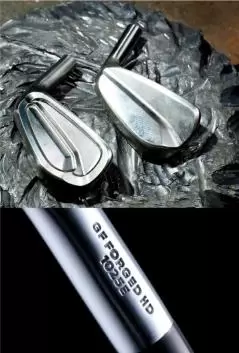 上の写真がクラフトマンが手作業で削った『ミズノプロ120/520』の金型のベース。ネックにある『GF FORGED』は世界特許であるグレインフローフォージドの刻印。