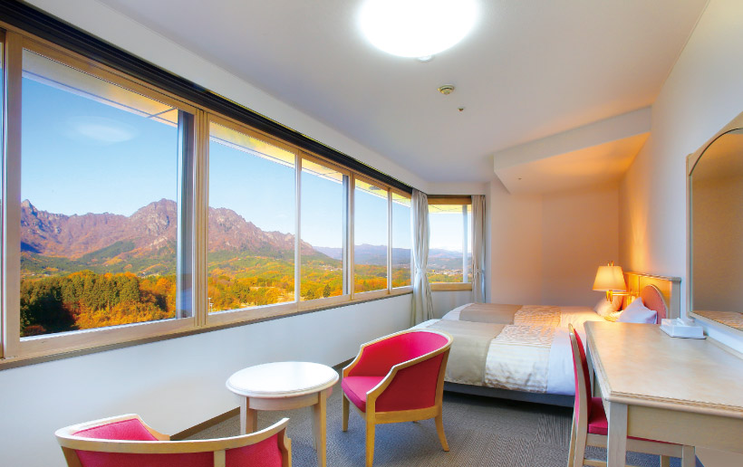 宿泊プレーも可能。ホテルから眺める妙義山と紅葉の眺望は格別。