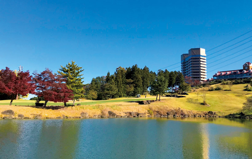 池の辺にたたずむ紅葉と、クラブハウスとホテルが望める9番ホール。
