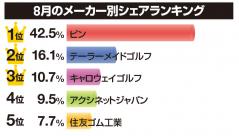 8月のゴルフ業界は「シブコフィーバー」の1カ月になったが、それはドライバーのランキングにも反映されている。圧倒的なシェアでトップとなったのはピンの『G410シリーズ』。同シリーズは発売当初から前作『G400シリーズ』を上回るセールスを記録していたが、渋野日向子の全英女子オープン優勝で人気に拍車がかかった格好となった。一部小売店からは「渋野プロの優勝後、これまであまり動きのなかった“10・5度のR”といったスペックの動きが出始めた」という声が挙がっている。
