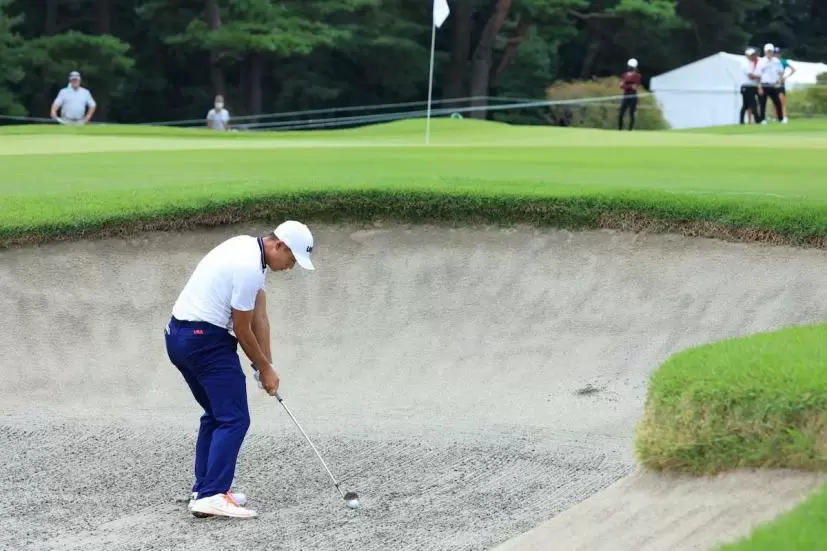 バンカーではことさら上下動が大敵。スイングではフラットに体を回すイメージをもつ。
