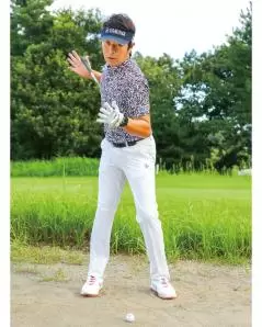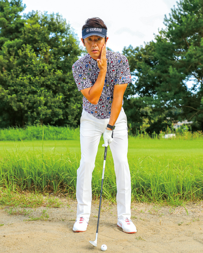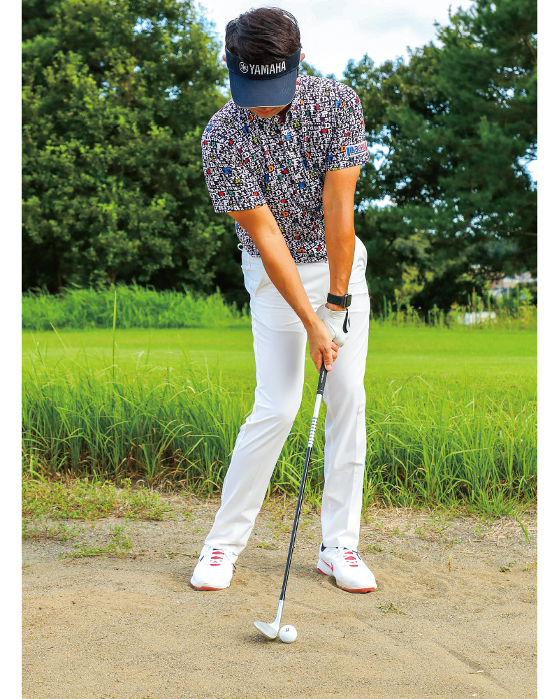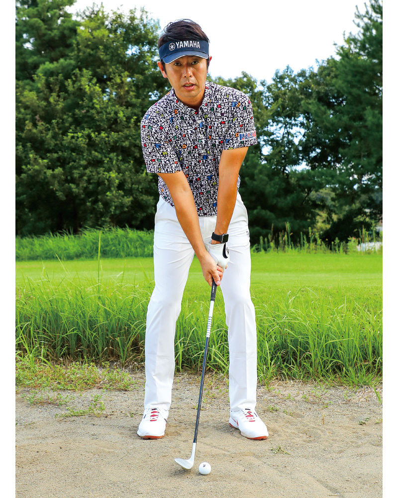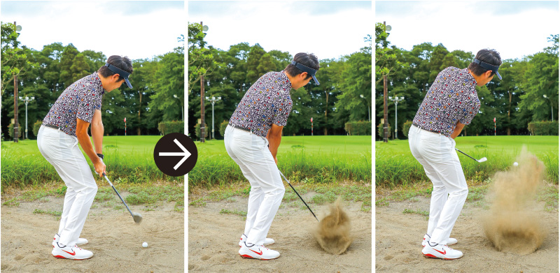 バンカーではことさら上下動が大敵。スイングではフラットに体を回すイメージをもつ。