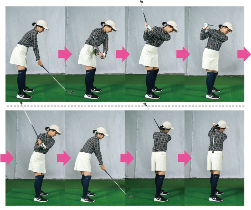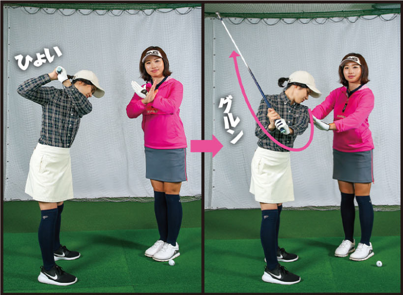 →上体をしっかり捻転させ、「グルン」と肩を回すことで、力強いスイングに!